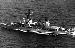 The warship returned to Newport on 10 October and, one month later, moved to New York where she became a Naval Reserve training ship. That duty constituted her mission for the remaining 16 months of her active career. Zellars was decommissioned on 19 March 1971, and her name was struck from the Navy List. Set aside for sale to the Iranian government, she was moved to the Philadelphia Naval Shipyard where she underwent extensive modification over the next 20 months. Renamed Babr (Tiger) (DDG-7), she was commissioned in the Imperial Iranian Navy on 12 October 1973 at the Philadelphia Naval Shipyard. As of 1998, she remained active with the Islamic Republic of Iran Navy,[2] though non-operational since 1994 and awaiting scrapping.[3][4]