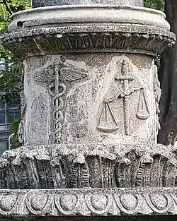 The fountain also features a sculpture of a lady on top of a lotus flower while holding a globe. The lady stands on a cylindrical pedestal adorned by the early disciplines offered in the university, namely the Caduceus for medicine, the Balance Scale for law, the Bowl of Hygieia for pharmacy, the ionic order for architecture, the atom for the sciences, and the total station and tripod for engineering. The lotus flower bowl is carried by four sphinxes. It is surrounded by four owls of Athena and open shells.[8][9]