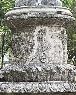 The Arch of the Centuries prominently stands at the center of the Plaza Intramuros. The arch was the main doorway to the university when the campus was still in Intramuros from 1680 to 1941. The central lower section of the original facade was transferred piece by piece and reconstructed in the Manila campus in 1954. It is flanked by the Fountain of Wisdom and the Philippine flagpole to its west, and the Fountain of Knowledge and the UST flagpole to its east.[2][3]