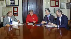 Senators Joe Biden (left) and Frank Church (middle) with president of Egypt Anwar el-Sadat after signing the Egypt–Israel peace treaty, 1979