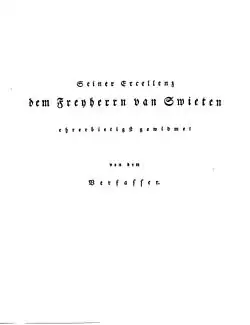 When Forkel published his Ueber Johann Sebastian Bachs Leben, Kunst und Kunstwerke: Für patriotische Verehrer echter musikalischer Kunst in 1802 it was the first biography on the composer published as a separate book. Forkel dedicated the work to Gottfried van Swieten. Van Swieten was an early Bach adept, for instance making Mozart familiar with the baroque composer.