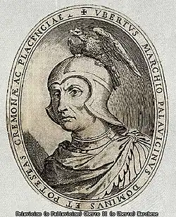 Due to growing rivalry with Ezzelino III da Romano, Pallavicino later started an allegiance with the Guelph faction, playing a decisive role in the Battle of Cassano (1259), where the Lombard-Guelph League defeated Ezzelino’s forces. In reward for his services, Pallavicino was granted control over major cities: Milan, Como, Lodi, Novara, Tortona, and Alessandria.[3] Despite this shift, when Charles I of Anjou invaded Lombardy, Pallavicini once again sided with the Ghibellines, although he suffered several defeats during this renewed conflict.[4]