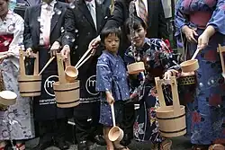 A public campaign for uchimizu, named “Sidewalk Sprinkling Campaign in Tokyo,” was initiated in 2003 by a coalition of non-profit organizations.[3] This campaign aimed to address the issue of climate change and the urban heat island effect, which is the phenomenon of urban areas having higher temperatures than that of rural ones. The campaign was conducted on August 25 in Tokyo, where participants were encouraged to sprinkle the streets with recycled rain and bath water. An estimated 340,000 people participated, with some dressed in yukata to honor traditional Japanese culture. After the event, temperatures were reported to have decreased by one degree Celsius.