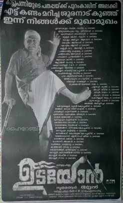 Udayon (transl. Owner/Overlord) is a 2005 Indian Malayalam-language action-comedy film written and directed by Bhadran and produced by Maha Subair. It stars Mohanlal in dual roles: 75-year-old farmer Suranadu Kunju and his happy-go-lucky son Papoyi, Laya plays the female lead role and also features Salim Ghouse, Manoj K. Jayan, Kalabhavan Mani, Innocent, Jagathy Sreekumar and Siddique in substantial roles. The film features original soundtrack composed by Ouseppachan.[1]