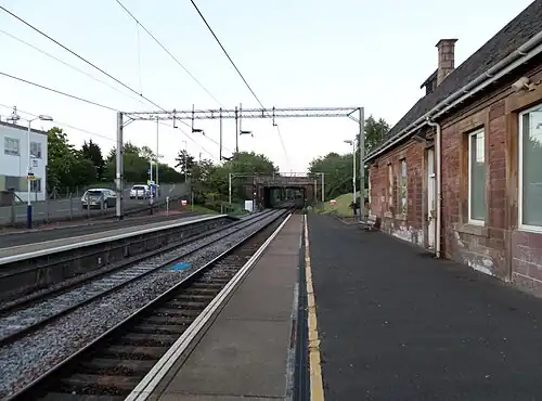 The building on Station Road, housing various public facilities,[6] leads to Platform 1 (Glasgow-bound trains). A footbridge over the double track connects to Platform 2 (Motherwell/Edinburgh-bound trains) and the car park.