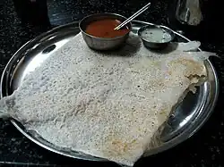 The ubiquitous Indian dish dosa has its origins in Udupi, according to P. Thankappan Nair.[5] Saaru, a spicy pepper water, is another essential part of the menu, and so are jackfruit, colocasia leaves, raw green bananas, mango pickle, red chillies, and salt. Adyes (dumplings), ajadinas (dry curries or stir fry curries), and chutneys, including one made of the skin of the ridge gourd, are specialities.[6]
