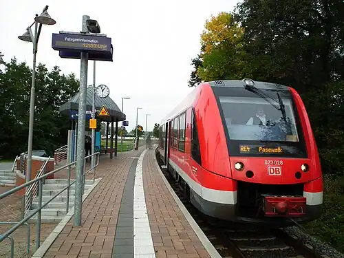 Ueckermünde Stadthafen (German: Bahnhof Ueckermünde Stadthafen) is a railway station in the town of Ueckermünde, Mecklenburg-Vorpommern, Germany. The station lies on the Jatznick–Ueckermünde railway line and the train services are operated by DB Regio Nordost. The current station opened on 15 August 2009, as part of the northern extension of the line into Ueckermünde.[3]