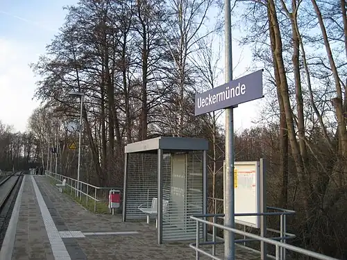 Ueckermünde station (German: Bahnhof Ueckermünde) is a railway station in the town of Ueckermünde, Mecklenburg-Vorpommern, Germany. The station lies on the Jatznick–Ueckermünde railway line and the train services are operated by DB Regio Nordost. The current station opened on 15 August 2009, as part of the northern extension of the line into Ueckermünde.[2]