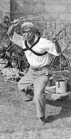 Upon Kanagusuku Ufuchiku's death, Shosei Kina (1882–1981)[7] became the second generation Soke or head master, even though he was the youngest and most junior of all the students. Kina first learned saijutsu from men in his village as a teen in Shimabuku,, excelling in Tsuken Shitahaku no Sai and Chatan Yara no Sai, but he began his training in ufuchiku kanagusuku in 1906, wherein he furthered his understandinog of use of the sai and jo/gusan and was exposed to the twenty-five weapons of Kanagsuku's kobujutsu.[8] Shosei Kina Okinawan students consisted of Shinyei Kyan, Shoshin Kina, Masanobu Kina, Kantoku Izumikawa, Seishin Higa, Kaishu Isa and Kiichi Nakamoto among others. Kina became a member of the Okinawa Kobudo Kyokai in 1961 and its continuation as the Okinawa Karate Kobudo Rengokai in 1968 from which he was awarded the 10th Dan Rank.[9] In October 1975, Kina Sensei founded the Ufuchiku-den Ryūkyū Kobujutsu Hozonkai and served as its first President with Kaishu Isa assigned as the Vice-President.
