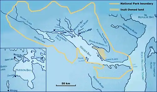 Ukkusiksalik National Park (/uːkuːˈsɪksəlɪk/)[1] is a national park in Nunavut, Canada. It covers 20,885 km2 (8,064 sq mi) of tundra and coastal mudflats south of the Arctic Circle and the hamlet of Naujaat (formerly Repulse Bay), from Hudson Bay's Roes Welcome Sound towards the western Barrenlands and the source of Brown River. The park surrounds Wager Bay, a 100 km (62 mi)-long inlet on the Hudson Bay. Although the smallest of Nunavut's four national parks, it is the sixth largest in Canada. Its name relates to steatite found there: Ukkusiksalik means "where there is material for the stone pot" (from ukkusik, meaning pot or saucepan like qulliq).