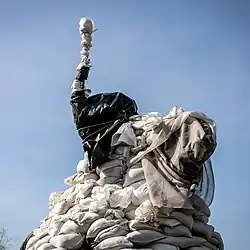 Many monuments and memorials were protected with bags of sand or wrapped in various materials. In Kyiv, approximately 28 objects were protected in this way as of mid-April.[13] Residents in Lviv attempted to help preserve several stone statues and fountains that could not be dismantled, by wrapping them in plastic, foam and other materials. Additional efforts were photographed and posted by the Lviv Foundation for the Preservation of Architectural and Historical Monuments of wooden frames and boards being used to protect monuments and church stained glass windows.[14][13]