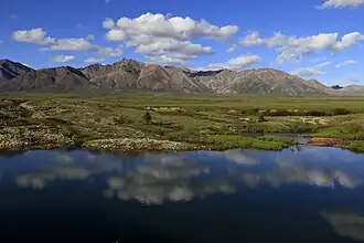 The Ulakhan-Chistay Range is the highest subrange of the Chersky Range system. It displays a clear Alpine relief and extends from NW to SE for about 250 kilometres (160 mi) south of the Moma Range. It is parallel to the latter and separated from it by a wide intermontane basin, where the Ulakhan-Chistay River and the Moma River flow from the southeast and join the Indigirka. From the southwest, the range is bound by the Erikit River, a left tributary of the Moma, and the Nera Plateau, beyond which rises the Tas-Kystabyt, also known as (the Sarychev Range).[4]