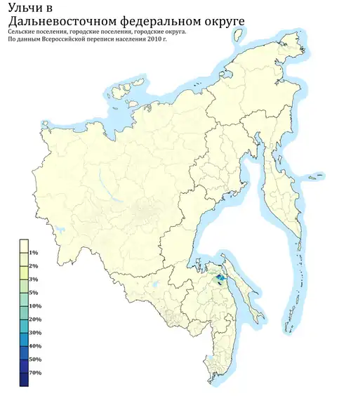 The Ulch people, also known as Olcha, Olchi or Ulchi, (Russian: ульчи, obsolete ольчи; Ulch: нани, nani) are an Indigenous people of the Russian Far East, who speak a Tungusic language known as Ulch. Over 90% of Ulchis live in Ulchsky District of Khabarovsk Krai, Russia. According to the 2002 census, there were 2,913 Ulchs living in Russia—down from 3,173 recorded in the 1989 census, but up from 2,494 recorded in the 1979 census, and 2,410 recorded in the 1970 census. According to the 2010 census there were 2,765 Ulchs in Russia.