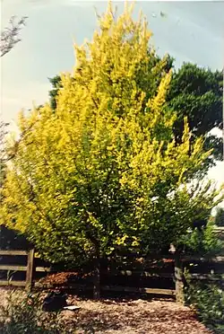 The Field Elm cultivar Ulmus minor 'Dicksonii', commonly known as Dickson's Golden Elm, is a yellow-leaved tree raised in Chester in 1900 by Dickson's Nursery, which distributed it from the autumn of 1907 as 'Golden Cornish Elm'.[1][2] 'Cornish Elm' was the name often given in error to Guernsey or Wheatley Elm by the local authorities who planted the latter extensively, an error which may have influenced the choice of name by Dickson's nursery.[3][4] 'Dicksonii' is usually listed as a variety of Guernsey Elm rather than Cornish Elm, Bean giving 'Wheatleyi Aurea' as a synonym,[5] and Hillier 'Sarniensis Aurea'[6] and later U. × sarniensis 'Dicksonii'.[7] Clibrans' nursery of Altrincham, however, described it (1922) as otherwise identical "in habit and constitution" to 'type' Cornish Elm (the nursery marketed Guernsey Elm as 'Wheatleyii').[8] The Späth nursery of Berlin distributed it from c.1913 as U. campestris cornubiensis Dicksonii.[9][10] The nursery Messieurs Otin père et fils of Saint-Étienne sold an Ulmus Wheatleyi aurea pyramidalis, with leaves marbled yellow, in 1882, earlier than Dickson's introduction.[11]