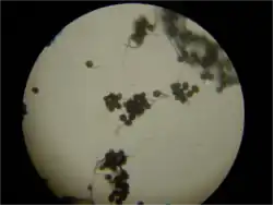 Conidia are black, rough, with pointed base when young, with both transverse and longitudinal septae, single or in a short chain (only in U. chartarum). Conidiophores are pale brown, erect, multicelled, and develop conidia in a sympodial mode. The two common species of indoor Ulocladium are U. botrytis and U. chartarum. This genus is closely related to Alternaria and Stemphyllium. Ulocladium conidia are characteristic and can be identified by properly trained laboratory analysts, although spores of Alternaria and Pithomyces may be confused with Ulocladium.