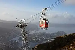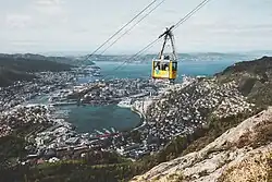 Ulriksbanen is a passenger aerial tramway in Bergen, Norway. It connects the mountain Ulriken to the city, and is frequently used by tourists as well as locals. The tramway was first thought of by Frithjof Meidell Andersen in 1954, and a company was established in 1959. After having been constructed by a Swiss company, Ulriksbanen opened in 1961. Ulriksbanen, branded as Ulriken643, in reference to the height of Mount Ulriken, opened with a new cable car (50 person capacity) and new bigger Skyskraperen restaurant in October 2021.