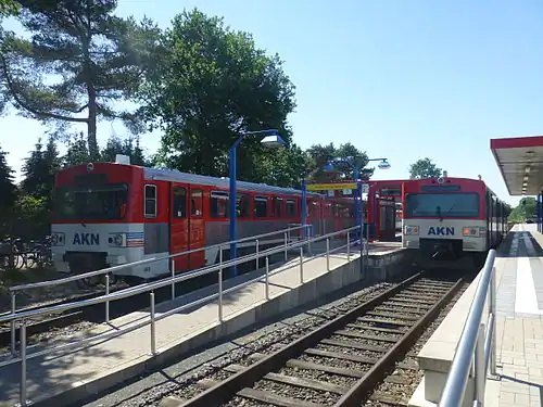 Ulzburg Süd station is a hub on the AKN Eisenbahn network in the municipality of Henstedt-Ulzburg in the German state of Schleswig-Holstein. It is where AKN’s trunk line (the Hamburg-Altona–Neumünster railway) and the Alster Northern Railway, which are now traversed by AKN lines A1 and A2, meet. In addition, trains on line A3 (the Elmshorn-Barmstedt-Oldesloe railway) begin and end in Ulzburg Süd.