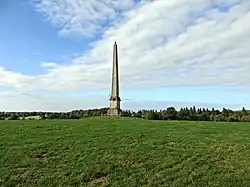 The obelisk is made from grey limestone ashlar and is square in cross section.[11][2] The 70 ft (21 m) obelisk sits atop a two-tier stepped square plinth with a moulded cornice on the upper tier.[11][1] There is no inscription on the plinth.[2] At the top of the obelisk is a stone ball finial, which was originally gilded, and a metal spike, to which was originally affixed a copper eight-armed cross (which has also been described as a star).[12][11][1][2]