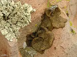 Umbilicaria phaea is a brown, umbilicate foliose lichen that grows up to 6 cm (2.4 in) in diameter, sometimes in colonies covering large patches of desert rocks.[1]:โ127โ [2] One variety that grows in northern California is brilliant red.[1] It is (monophyllous) with a single 1 โ 5 cm flattish leaf-like cap on top of an anchoring stem (umbilicate).[2] The leaflike top is smooth with some lobes, roughly circular, thin, and brittle.[2] The lower surface is light gray to light brown.[2] It has up to 2.5 mm black circular to slightly polygonal spots that are the fruiting bodies (apothecia), slightly sunken into the main nonfruiting body part (thallus).[2] It grows on siliceous boulders in very dry climates of western North and South America, where it is usually the most common member of its genus.[2]