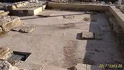 West of the synagogue a mikve was discovered, dated to the Herodian period (the second phase of the synagogue).[2][6] During the Hasmonean period (the first phase of the synagogue) there was already a sitting bath in the courtyard;[6] it seems that during the Hasmonean period there was a bath in the courtyard west to the synagogue.[2]