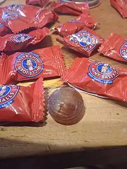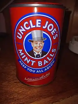 Uncle Joe's Mint Balls are mints produced by William Santus & Co in Wigan, Greater Manchester, England since 1898.[1] Despite their name, the mints are not truly spherical but oblate spheroids. The ingredients of Uncle Joe's Mint Balls are pure cane sugar, oil of peppermint and cream of tartar and are described on the tin as "suitable for vegans".