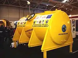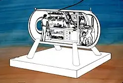 Launched for the first time in March 1978, this underwater shelter suspended in midwater (between 0 and 60 metres) is a mini scientific observatory 2.8 metres high by 2.5 metres in diameter.[47] The Aquabulle, created and experienced by Jacques Rougerie, can accommodate three people for a period of several hours and acts as an underwater refuge. A series of Aquabulles were later built and some are still being used by laboratories.[44][48]