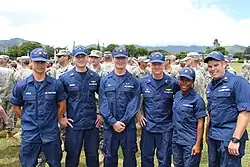 Coast Guard personnel serving in expeditionary combat units such as Port Security Units or Law Enforcement Detachments, and Coast Guard personnel deployed overseas (e.g. as part of PATFORSWA) may wear the Navy Working Uniform Type III or the Army Combat Uniform[5] with distinctive Coast Guard insignia.[3]
