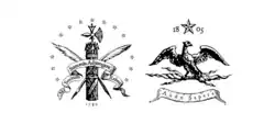 The Union Society's badge was light blue with a silver or white emblem. The emblem featured symbols relating to the organization's history—a fasces on top of two quills, with a scroll, and a semi-circle of stars. Its motto was "Me Socium Summis Adjungere Rebus" or "I Wish to Ally Myself With the Greatest Things".[12]