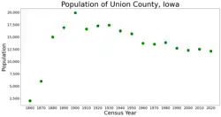 Union County is a county located in the southern part of the U.S. state of Iowa. As of the 2020 Census, the population was 12,138.[1] The county seat is Creston.[2] Organized at a time of tensions before the Civil War, the county was named in 1853 for the union that people wanted to preserve. Union County peaked in population at the 1900 Census. Its economy is based on agriculture and related industries.