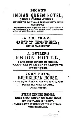 - ^ "Union Hotel". Daily National Intelligencer and Washington Express. June 30, 1831. p. 1. Retrieved May 12, 2024.