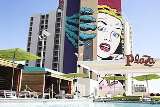 The hotel closed for renovations on November 11, 2010. It acquired furniture, carpets, and fixtures from the bankrupt Fontainebleau Resort Las Vegas project on the Las Vegas Strip.[12] From November 2010 to August 2011, the Plaza operated its sports & racebook, showroom, one bar, and a portion of the casino. By March 2011, the south tower and the casino had finished renovations, re-opening on August 24, 2011.[13] The hotel officially re-opened for business on September 1, 2011.[14] The renovation project cost was $35 million.[15] The property has undertaken numerous renovations and amenity enhancement projects since 2011. In 2014, the Plaza announced that a new 3,500-seat facility would be constructed at the hotel to become the new home arena for the Las Vegas Wranglers minor league hockey team of the ECHL.[16] However, the hockey team suspended operations for the 2014–15 season and would eventually fold mid-season.[17] In 2016, the Plaza fully refurbished its rooftop pool, creating an outdoor space with a wet deck, hot tub, private cabanas, bar, and food truck. The Plaza has 13 pickleball courts, more than any other hotel-casino in Las Vegas.[18] The Plaza built the multipurpose venue CORE Arena, an equestrian center in downtown Las Vegas with 80 equine stalls,[19] which hosts events like rodeos and monster truck shows. CORE Arena has hosted the Las Vegas Days Rodeo in partnership with the Commission for the Las Vegas Centennial since 2019.[20] In 2019, a $15 million renovation created more than 100 Luxe guest rooms and suites on the top floors of the North Tower.[21][22] The Plaza has three 21-story murals by artists Shepard Fairey, D*Face and Faile on its North Tower.[23]