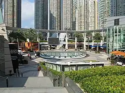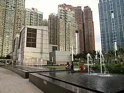 On the roof of the Union Square shopping mall, three storeys above the ground, is a pseudo ground level public place with walkways, gardens and a central plaza surrounded by outdoor cafés and bars. Entrances to the various building complexes of Union Square are located on this level.[1] Although Union Square was conceived as an interconnected space centred on transport infrastructure, it was criticised in a 2013 University of Hong Kong study as being cut off from its surroundings, especially for pedestrians. Paul Zimmerman said Union Square is "an island of the rich disconnected from its surroundings", and a lesson for future urban planners. This concern is shared by Farrell, who said there were pre-determined site constraints, and little could be done to mitigate them.[1]
