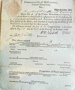 - ^ Legislative packet, Union Turnpike Corporation, June 13, 1803, Massachusetts Archives