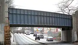 Prior to the construction of Grand Central Parkway and Interboro Parkway (now the Jackie Robinson Parkway) in the 1930s,[12] Union Turnpike was heavily used, and developed businesses throughout its length. In 1929, there was a proposal to make improvements to four existing roads in order to make them major thoroughfares between Queens and Nassau, namely Astoria Boulevard, Northern Boulevard, Nassau Boulevard, and Union Turnpike.[13] Civic associations in Jamaica opposed the Union Turnpike proposal, and they convinced Queens Borough President George Harvey.[14] Nevertheless, the section of Union Turnpike from Kew Gardens to the Nassau County line was converted from a narrow unpaved road to a paved multi-lane highway in the late 1930s, in advance of the 1939 New York World's Fair.[15] Around the same time, the turnpike was depressed below Queens Boulevard in conjunction with the construction of the Queens Boulevard Subway, and extended eastward from Fresh Meadows towards Marcus Avenue in Nassau County.[4][16]