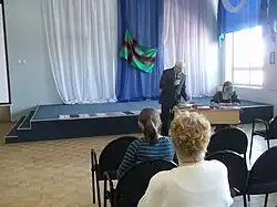 On May 25, 1989, the Karelian national-cultural public organization "Society of Karelian Culture" was created, which was registered in August 1989 and was renamed to the "Union of the Karelian People". The organization is responsible for creating the "Oma Pajo" choir, Finnish language "Carelia" newspaper and the "Oma Mua" newspaper in 1990 and "Vienan Karjala" newspaper in 2000.[2] The Union of Karelian People also organized education in Karelian in the PetrSU, the "Čičiliusku" puppet theatre company and popularized the game of Kyykkä in the Republic. The UKP works closely with the Ministry of the Republic of Karelia for National Policy and the Finnish Union of White Sea Karelians. The organization also helps to translate various government projects into Karelian.[3]