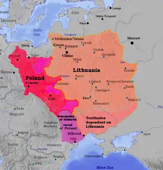 The relations between Poland and Lithuania were not particularly friendly. The two states were allies before, when Jogaila's aunt Aldona of Lithuania was Queen of Poland between 1325 and 1339.[2] Poland and Lithuania battled each other in the decades-long Galicia–Volhynia Wars, but also saw opportunities to regain lands lost to Hungary and regarded the Teutonic Knights as the common enemy.[7] It is unknown who and when proposed Jogaila as the groom for Jadwiga. Some hints show that planning and negotiations might have started as early as 1383. For example, Jogaila attacked Siemowit IV, Duke of Masovia, when he advanced his claims for the Polish throne.[8] By the time Lithuanian envoys participated in Jadwiga's coronation in fall 1384, Jogaila's candidacy was widely known.