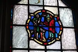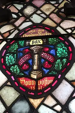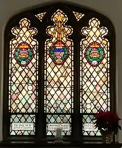 The interior underwent extensive renovation in the 1920s, including installation of stained-glass windows by the firms of Franz Xaver Zettler (sanctuary and vestibule) and Charles Connick (women's parlor). The interior has stayed essentially unchanged since those renovations, and, like the exterior, the interior work is atypical of the firms that produced it.[6] Subjects memorialized in the windows include colonizer Christopher Columbus and enslaver Thomas Jefferson.[7] The choices were influenced by the views of a founding member of the church, Milton T. Garvin (1860–1936), a prominent local merchant and philanthropist who personally funded the construction and decoration of the building and worked closely with the architects and ministers involved. Garvin's family were Hicksite Quakers from the Nottingham Lots community of southern Pennsylvania and Maryland,[8] and he joined the "new Unitarian movement", as he referred to it,[9] in the absence of a recognized Quaker meeting in Lancaster.[10] Garvin became a Unitarian activist and initiated the Association's Religious Arts Society (1923), but was a life-long "advocate for universal peace",[11] which complicated his attitude toward the controversial pro-war stance of the Association during World War One.[12] After the war Garvin commissioned sanctuary windows which, while taking World War One and the American Civil War as subject matter, advocate for peace and reconciliation as core values in American history and civic life. The sanctuary windows and other sanctuary decoration were designed by the Swiss-American architect and artist Woldemar H. Ritter (1880 – c. 1935), whose modernist artistic approach was approved by Garvin and distinguishes the Lancaster windows from other work by Zettler. The sanctuary windows were installed in 1926. The windows by Charles Connick were commissioned for the women's parlor and were designed by Connick; they were installed in 1929 and dedicated in 1930.