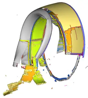 Because the aluminum versus the CFRP structure has the ability to yield while absorbing the same amount of energy, it can redistribute the FBO loads between the fan case and the inlet without causing failure to the inlet, or the fan case to inlet interface. The inlet and fan cowl structural analyses showed that the CFRP aft bulkhead design was less capable than the aluminum bulkhead that was tested during engine certification test and determined that multiple possible scenarios could have led to their separation:[3]