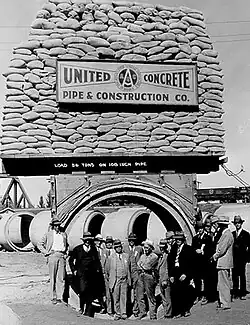 United Concrete Pipe Corporation was a manufacturing and construction company based in Southern California. It was in the business of constructing and installing concrete water pipes for irrigation, water lines, sewers, and drains, and after 1930 expanded into general construction, building concrete bridges, tunnels, concrete roads, and building foundations.[1] United Concrete Pipe was established in 1919 in Ventura, California, by (Thomas) Tom P. Polich. In 1924 Steve Kral and B. J. Ukropina became partners with Polich. Tom Polich was born on March 22, 1888, in Serbia and came to the US in 1905. Polich worked for a concrete company in Van Nuys, California, before starting his own company. His first contract was installing a irrigation system in Tuttle, California. In the 1930s under the Works Progress Administration the company grew to nine plants and became a general contractor, not just a pipe company. Plants were in California, Texas and New Mexico. In 1953 the three started a new parallel joint venture Ukropina-Polich-Kral of San Gabriel, a general contractor company. United Concrete Pipe Corporation headquarters was at 85th St. and Vermont Ave., Los Angeles, California. One Works Progress Administration project was the Wawona Tunnel built in 1933.[2] In 1937 United Concrete Pipe completed a Works Progress Administration project the Mad River Water Supply Project in Eureka, California. United Concrete Pipe Corporation last plant closed in 1994, at Riverside, California.[3][4][5][6][7][8]