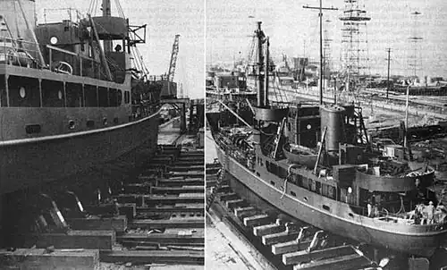 In 1943, United Concrete Pipe established a shipyard division in Long Beach, California, to build small coaster ships for the US Army under the Emergency Shipbuilding Program. The shipyard of United Concrete Pipe was in Long Beach at Berth 83, at the north side of Channel 2, at the entrance to the channel. Unique to the boatyard was the assembly line railway the ships were built on. As the boat was built it would move down the rail track towards the water. The steel for the shipyard was shaped by United Concrete Pipe's Baldwin Park, California, plant. The Army ships were 176-foot, a beam of 30 feet, a draft of 8 feet, and were 935 tons loaded. Power was from two General Motors Cleveland diesel engines each with 500 hp. The first ship was complete on March 23, 1944.[9][10][11][1][12]