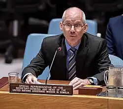 36. ^ "Secretary-General Appoints Nicholas Haysom of South Africa Special Representative, Head of United Nations Assistance Mission in Somalia". United Nations: Meetings Coverage and Press Releases. 12 September 2018. Retrieved 28 January 2024.