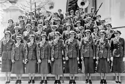 In January 1951, Howard organized the 543rd Air Force Band made up of 19 female airmen from the Women in the Air Force (WAF) program. He expanded this group to some 50 members and in June 1955, in Air Force Regulation 190-21, they were officially designated "United States WAF Band", acknowledging their de facto status as USAF representatives rather than their original status as a simple base band. Their official mission became to "assist, within their capabilities, in promoting Air Force objectives and enhancing the prestige of the Air Force and the United States."[2] This meant there were now two bands serving as ambassadors of the USAF: the all-male Air Force Band and the all-female WAF Band. The WAF Band was dissolved in 1961 following its commander's contravention of a directive from Howard restricting performances at civilian schools and county fairs.[2]
