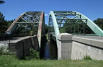The United States Navy Seabees Bridge is a through-steel two-hinged arch bridge over the Connecticut River located between Brattleboro, Vermont, and Chesterfield, New Hampshire. It carries the Franklin Pierce Highway, New Hampshire Route 9, which connects to Vermont Route 9 on the Vermont side.[1] It runs parallel to the Justice Harlan Fiske Stone Bridge which it replaced, but which has been retained as a pedestrian and bicycle bridge.