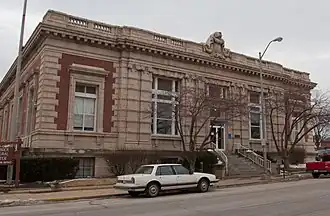 The U.S. Post Office, now known as the Springer Cultural Center, is a historic government building located at Randolph and Church Streets in Champaign, Illinois, United States. Built in 1905, the building originally served as Champaign's post office. The office of Supervising Architect James Knox Taylor designed the Beaux-Arts building. The brick building features extensive limestone and terra cotta ornamentation. The front facade has four pairs of Ionic pilasters separating the entrance and two sets of windows. A frieze reading "UNITED STATES POST OFFICE" and a dentillated cornice run above the pilasters. A balustrade runs along the front edge of the roof; a large scrolled cartouche marks the center of the balustrade. In 1966, the post office was converted to a federal building.[2]