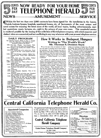 Incorporated in California in February 1912 by C. J. Ward, F. W. Bresse and S. H. Whisner. Demonstrations were begun on April 1, 1912 from 4th Floor of the Elks' Building.[34] In late 1913, provisions were made to lease a local theater, the Diepenbrock, to serve as a source for programming.[35] However, there was an abrupt change of plans, and instead the owners decided to merge their operations with the Pacific Telephone Herald Company.[36] The telephone newspaper service never became operational, either before or after the Pacific Telephone Herald merger. The company's charter was declared forfeited and repealed for non-payment of taxes in February 1915.[37]