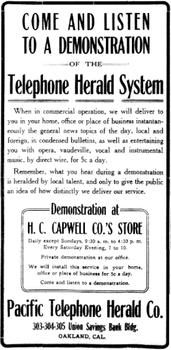 32. ^ "New Invention Enables One to Hear News, Concerts, Lectures and Sermons at Home", San Francisco Call, September 10, 1911, page 19.