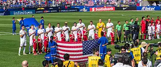 The United States line-up during the national anthem before their 2015 quarter-final against Cuba . The United States ended up winning 6–0, their joint-highest Gold Cup victory of all time.