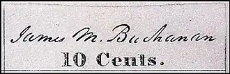 - Baltimore (twelve subjects: nine 5¢ stamps, three 10¢ stamps) (Note: Baltimore also employed three handstamps of the "James M. Buchanan" signature to imprint indicia on envelopes. The signature is not that of the future president, but of his cousin: James Madison Buchanan, the Postmaster of Baltimore.)