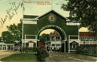 Indianola Park was an amusement park that operated in the University District from 1905 to 1937.[5] It was the biggest draw of the region, and streets carts took people to and from the location. The park peaked in popularity in the 1910s, entertaining crowds of up to 10 thousand with the numerous roller coasters and rides, with up to 5 thousand in the massive pool alone.[6] The park was also the home field for the Columbus Panhandles for half of a decade.[6][7] In the 1920s, new owners bought and remodeled the park, and it did well until it closed its doors at the end of the Great Depression.[8]