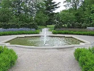 The English Garden was dedicated in the memory of Edna and Frank Miller in September 1998, by their son Frank Miller.[31] This garden demonstrates an English cottage gardening style. The garden includes a tall sheared European beech, hedge maple and white cedar hedge forming a symmetrical pattern of walls.[36] Boxwood hedges circle two gardens: The Nancy and Dr. Anthony Caspers Perennial Gardens, while yew hedges outline the walkway around them[31] Each perennial garden is packed with more than 30 flower species, combining to form a diverse medley of aroma and colour, and is therefore popular with pollinators.
